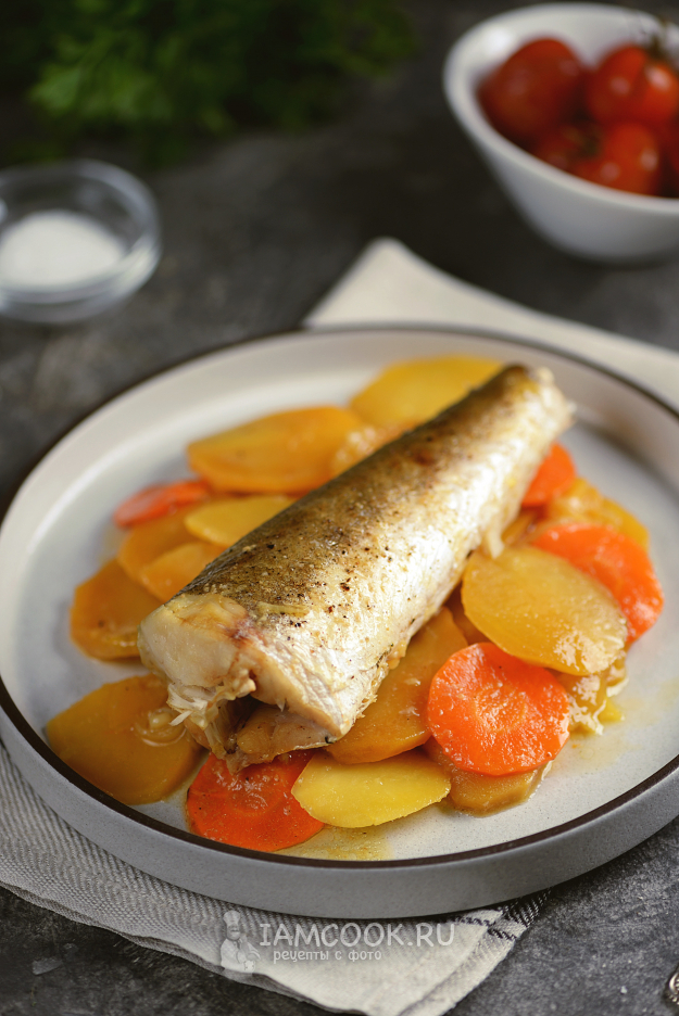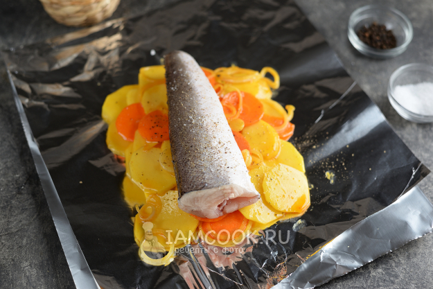 Хека почистите от чешуи и внутренностей, срежьте плавники на спине и пузе, посолите и поперчите по вкусу. Выложите рыбу поверх картошки.