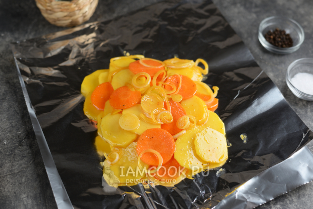 Сложите пищевую фольгу пополам глянцевой стороной вверх, выложите овощи небольшой горкой.