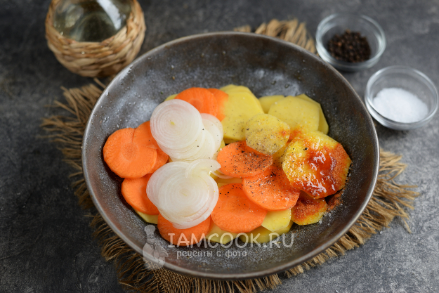 Картофель, лук и морковь нашинкуйте тонкими ломтиками, проще и быстрее это сделать с помощью специальной насадки или терки, измельчите чеснок. Переложите овощи в глубокую миску, влейте растительное масло, всыпьте приправу, соль и перец по вкусу. Перемешайте все тщательно, чтобы каждый ломтик картошки был покрыт маслом, тогда она быстрее приготовится.